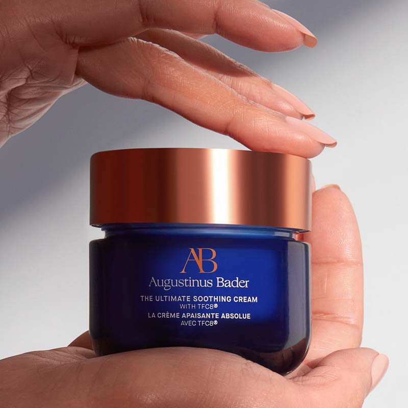 Augustinus Bader The Ultimate Soothing Cream showing in models hand opening lid