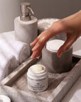 Close up of model holding Odacite Edelweiss Extreme™ Intense Repair Eye Cream with lid off and dabbing finger in eye cream