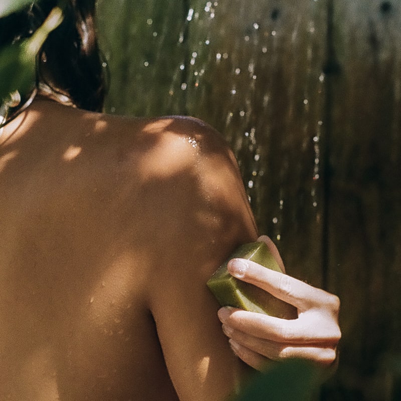 Bathing Culture Mind and Body Bar - Cathedral Grove (4.58 oz) - Model shown using product in outdoor shower
