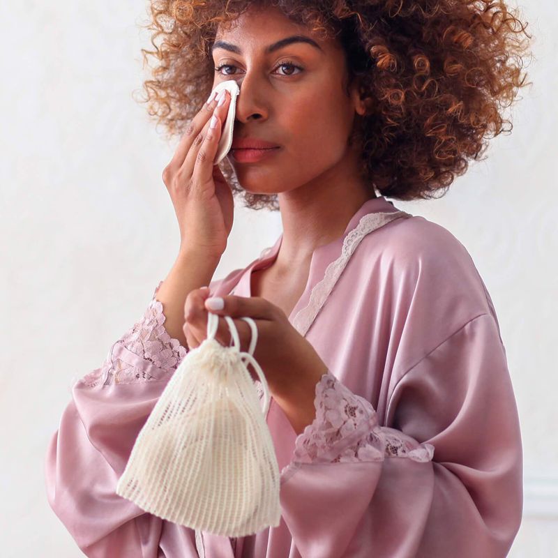 Daily Ritual Bio-Cotton Make Up Remover and Laundry Bag with contents shown by model