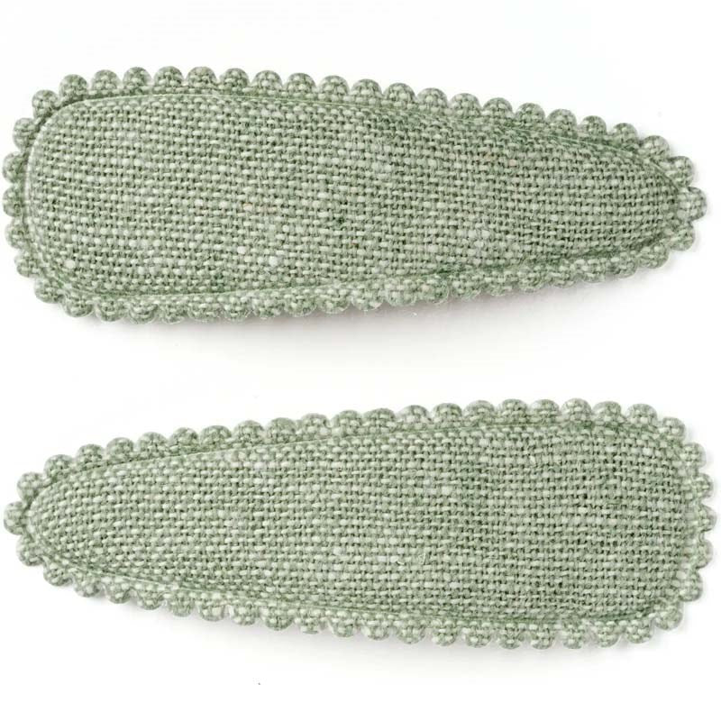 A beautiful, timeless set of sage green fabric covered snap clips featuring unique scalloped edge detail. Soft, comfortable and easy to wear. These pretty clips are perfect for any age from toddler to adult.