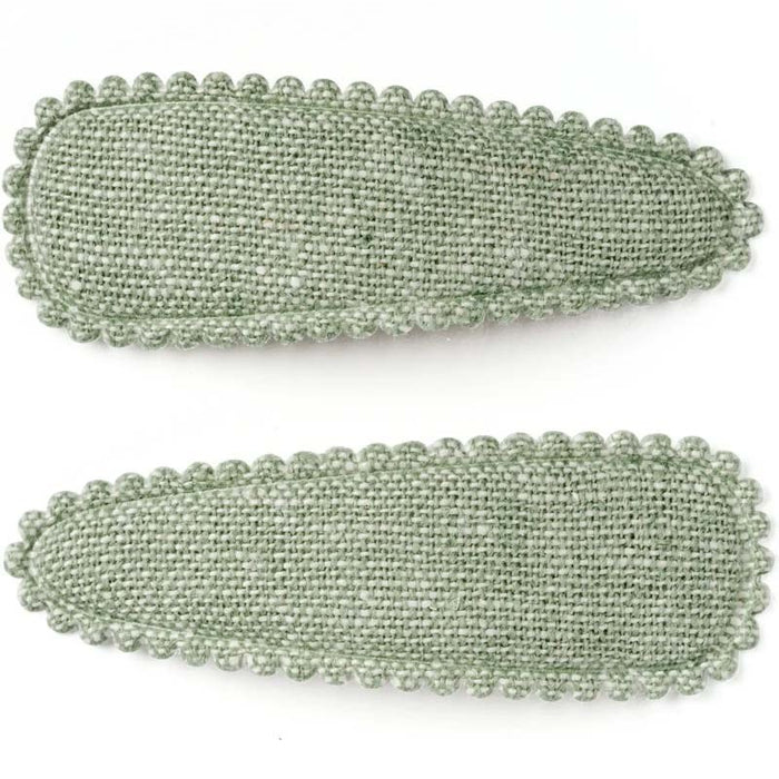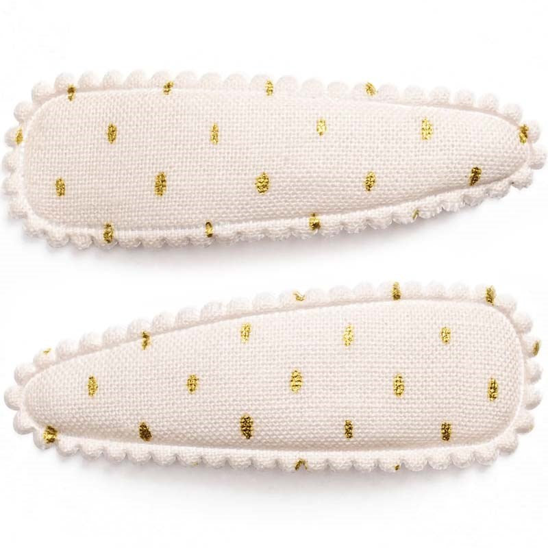 A beautiful, timeless set of pale pink fabric covered snap clips featuring unique scalloped edge detail, and organic metallic gold dots. Soft, comfortable and easy to wear. These pretty clips are perfect for any age from toddler to adult.