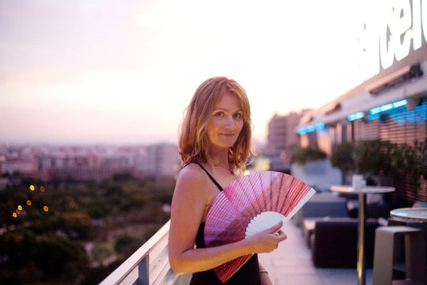 Founder of Khu Khu, Victoria Speyer holding fan on an outside balcony overlooking a cityscape
