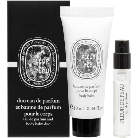 Includes: Diptyque Fleur de Peau Body Balm (10 ml) and Diptyque Fleur de Peau Eau de Parfum (2 ml).