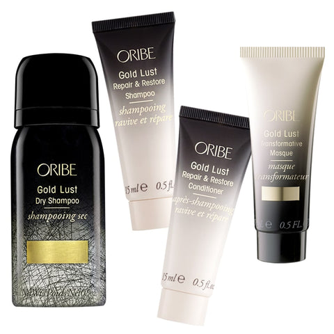 Perfect hair on the go! With your $130 or more SITEWIDE purchase, receive the Oribe Gold Lust Hair Essentials Kit, including travel-sized versions of their iconic Repair & Restore Shampoo (15 ml), Conditioner (15 ml), Transformative Masque (15 ml), and Dry Shampoo (43 ml).