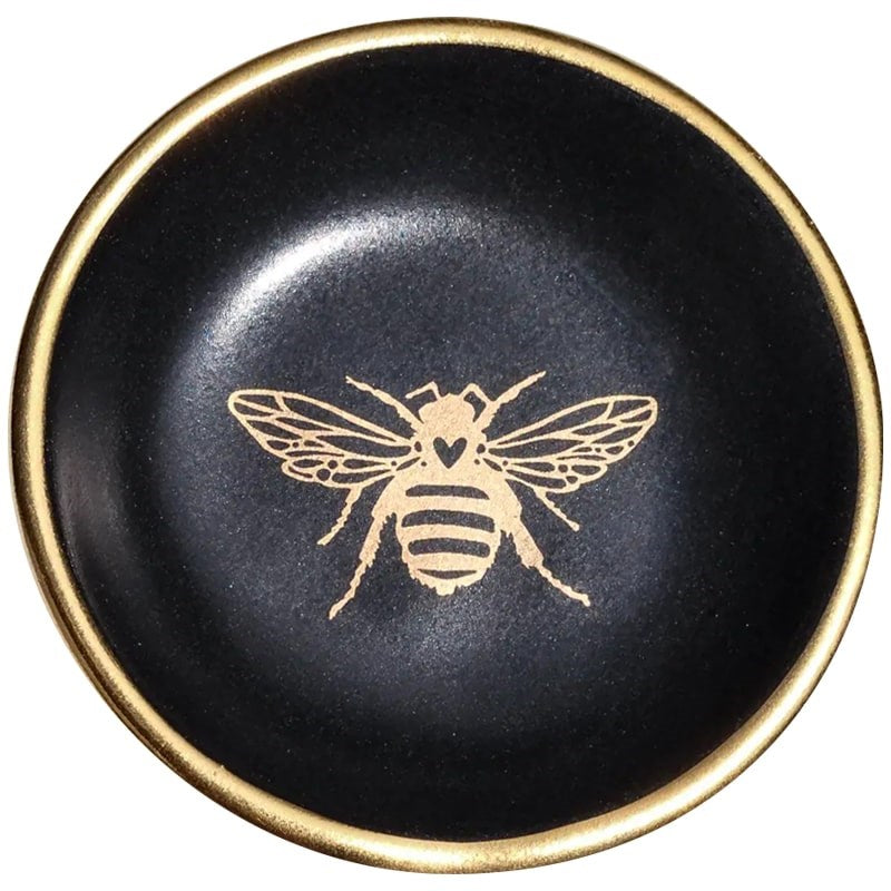 Each trinket dish is unique and feature a semi-matte black glaze, adorned with a delicate 22k gold bee silhouette at the center.