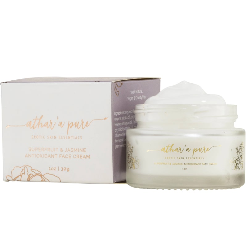 Rejuvenate and revive your skin. This luxurious organic, all natural face moisturizer is loaded with antioxidants, minerals and vitamins from berries, fruit, tea and herbs to prevent and reverse signs of aging. This best selling organic face cream is made with all natural, organic ingredients and antioxidants that even out skin tone to brighten up and hydrate your complexion. Intoxicate your senses with the light floral scent of pure Indian Jasmine essential oil for a luxurious Eastern Spa treatment.
