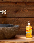 Model pumping Bathing Culture Refillable Rainbow Glass Mind and Body Wash in Cathedral Grove into palm of hand