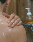 Close up of model applying Bathing Culture Refillable Rainbow Glass Mind and Body Wash in Cathedral Grove to shoulder with lather