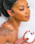 Sodium Bicarbonate, Citric Acid, Sodium Chloride (Dead Sea Salt), Magnesium Sulfate (Epsom Salt), Sodium Lauryl Sulfoacetate, Zea Mays Starch, Simmondsia Chinensis Seed (Jojoba) Oil, Theobroma Cacao (Cocoa Butter), Kaolin Clay, Hibiscus Sabdariffa Flower Powder, Pogostemon Cablin Leaf (Patchouli) Oil, Citrus Paradisi (Grapefruit) Oil, Citrus Aurantium Bergamia Fruit (Bergamot) Oil, Cananga Odorata Flower (Ylang-Ylang) Oil, Centaurea Cyanus (Blue Cornflower) Petals, Hamamelis Virginiana (Witch Hazel).