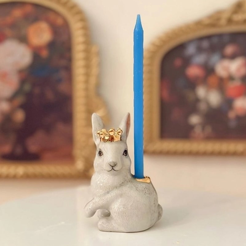 As you light a candle in her holder, let her remind you that ever moment is a chance to create something beautiful and unique. With her whimsical design and enchanting presence, the Royal White Rabbit is the perfect cake topper for your next celebration. She'll sprinkle your festivities with a touch of magic, as she leads you on a journey through wonderland. Let her be your guide, as she takes you beyond the limits of your imagination.