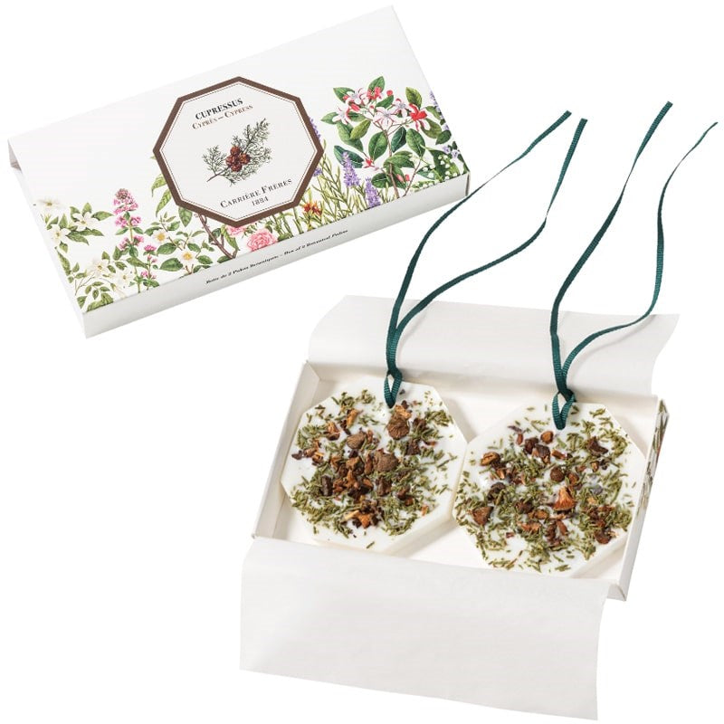 The botanical palets box contains two palets of the same fragrance. Practical, they are designed to perfume small spaces, like a wardrobe or drawer. Thanks to their ribbon, they can also be hung on a door handle or a coat hanger.