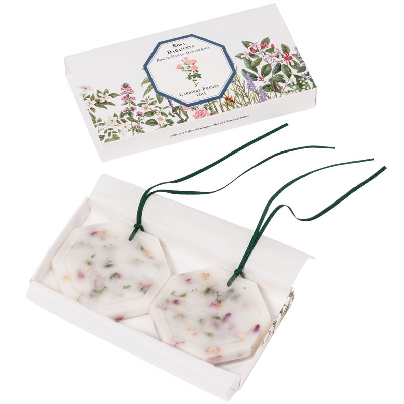 The botanical palets box contains two palets of the same fragrance. Practical, they are designed to perfume small spaces, like a wardrobe or drawer. Thanks to their ribbon, they can also be hung on a door handle or a coat hanger.