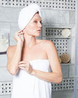 Ideal for taking care of your hair after the bath, shower, gym or during any beauty ritual. The Daily Hair Wrap Towel helps reduce frizz, reduce hair drying time and maintains the risk of split ends and excessive damage. This hair towel can be used on almost any length and texture of hair. One size fits all. Great for wearing while applying makeup or doing facials too!