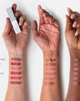 Flyte.70 S+S.LipSheer Tinted Lipstick Balm showing all shades on models' arms of different skin tones