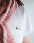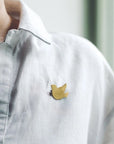 A super cute cuckoo silhouette in hand-hammered brass. There is a pin attached at the back. A great accent on a lapel or bag and perfect gift for the bird lover in your life. Irregularities in finish may occur.