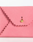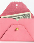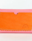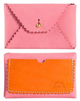The Scallop Wallet, in Carnation + Orange, is Immodest Cotton's classic design updated with hand-forged scalloped edges. The Wallets are made from Italian leather and each has a card pocket on the back for easy retrieval. It will fit several credit cards and dollar bills and is easily tucked into your pocket or bag.