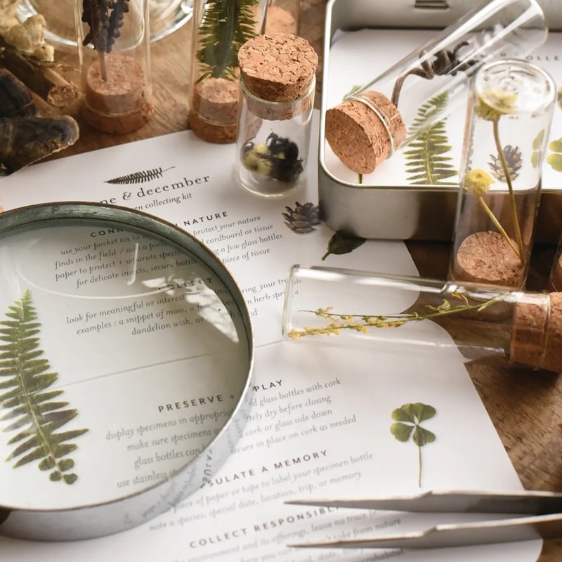 June & December designed and developed this specimen collecting kit to share their love of collecting, observing, and preserving memories from their outdoor adventures. Collect and preserve specimens found in the field with the pocket-sized tin, then use the contents to prepare, encapsulate, and display your finds. Each kit is meticulously assembled by hand in their studio.
