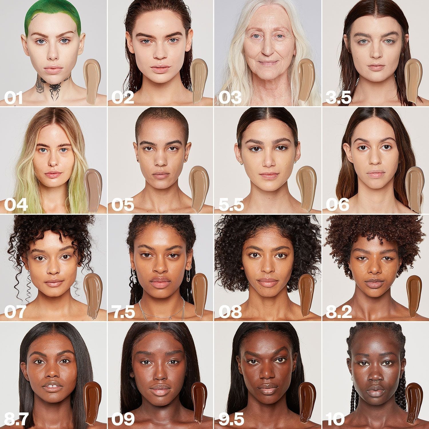 Kosas Cosmetics Revealer Concealer Super Creamy + Brightening Color Chart with colors on model faces