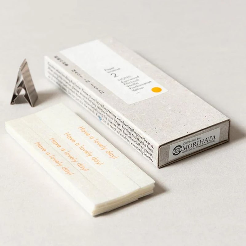 From the pioneers of fragrance behind the bestselling HA KO collection comes Washi Paper Incense Strips, a new type of incense combining friendly missives with rich aromas. Each box contains 30 strips of incense steeped in a blend of natural aromas carefully combined to create a specific scent, along with a metal clip to hold the incense as it burns.