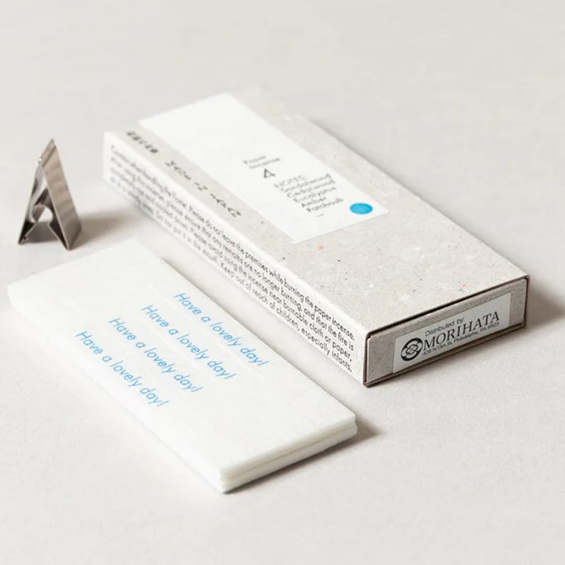 From the pioneers of fragrance behind the bestselling HA KO collection comes Washi Paper Incense Strips, a new type of incense combining friendly missives with rich aromas. Each box contains 30 strips of incense steeped in a blend of natural aromas carefully combined to create a specific scent, along with a metal clip to hold the incense as it burns.