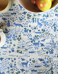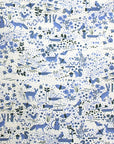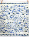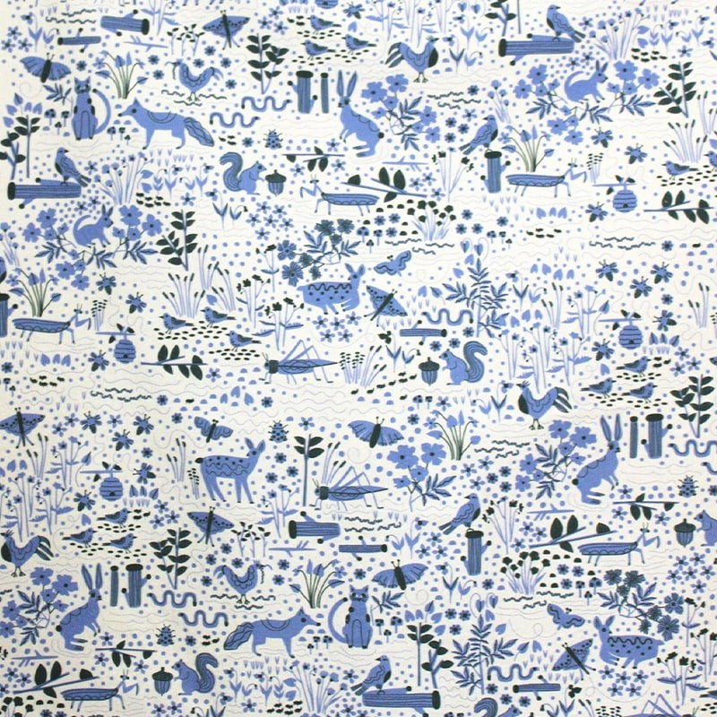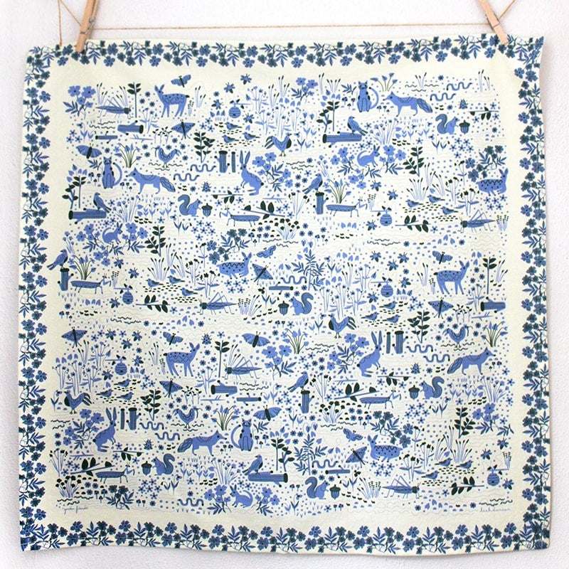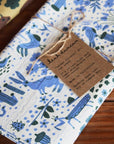 This is a flour sack tea towel featuring Leah Duncan's "Garden Friends" design with flowers, bugs, and lots of animal creatures. It features colors of periwinkle blue and dark hunter green on a creamy off white background. Pretty enough to hang on your wall or display in your kitchen.