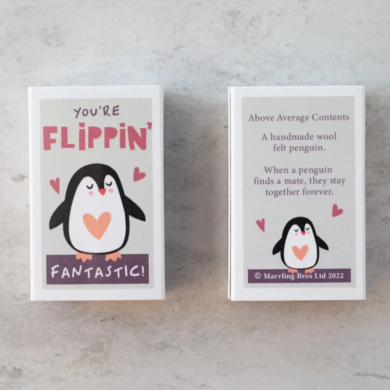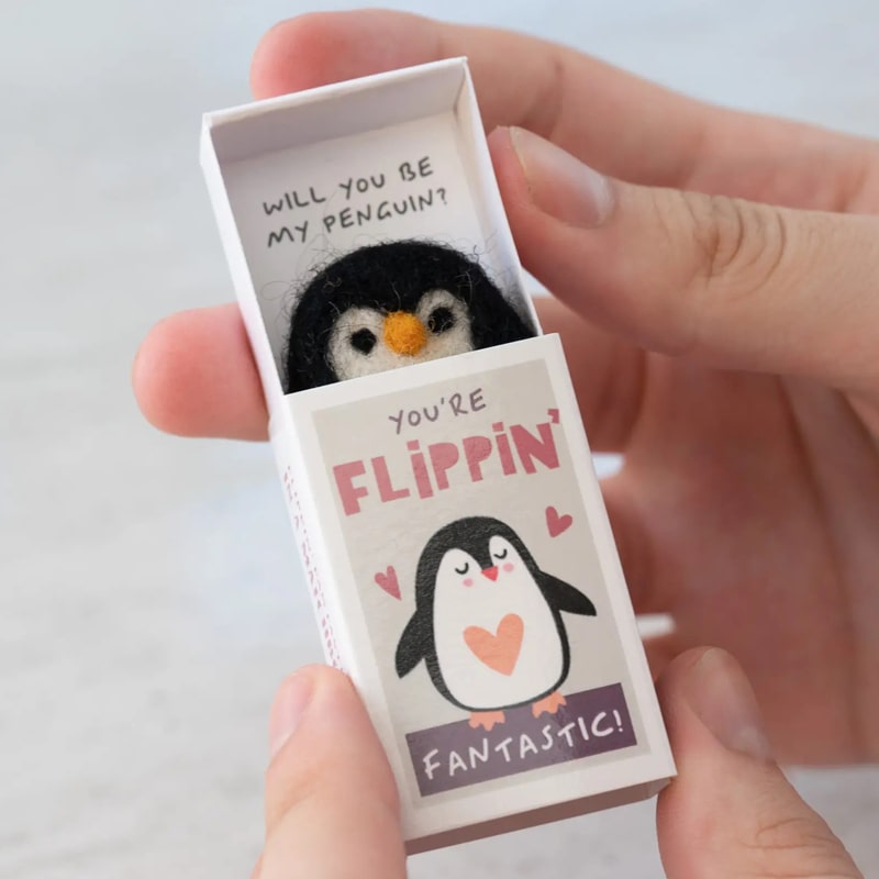 Once a penguin finds a mate, they stay together forever. Open the matchbox to reveal a gorgeous handmade wool felt penguin and the message ‘Will You Be My Penguin?’