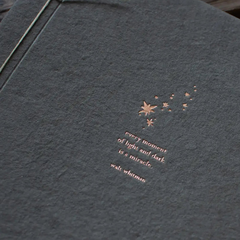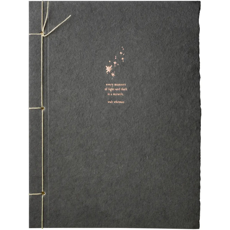 Minimal design with a striking quote on handmade paper cover. Japanese bound with 100 grey ruled cream pages.