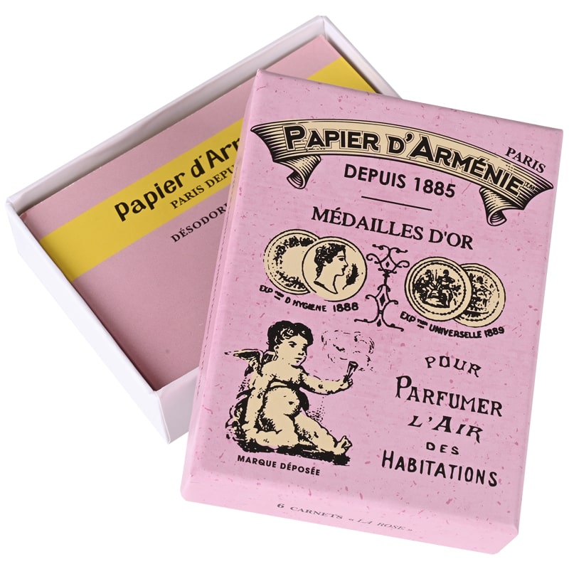 Papier dArménie is offering you this elegant Vintage presentation box inspired by the 1885 graphic style holding 6 "La Rose" booklets. The historical visual illustrates the age of "Papier dArménie" and reminds us all the awards won by the brand since 1885.