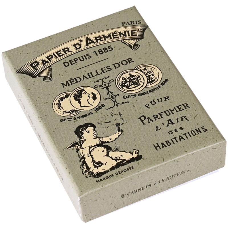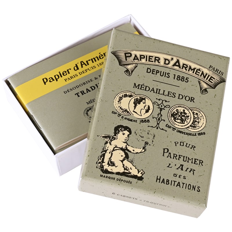 Papier dArménie is offering you this elegant Vintage presentation box inspired by the 1885 graphic style holding 6 "Tradition" booklets. The historical visual illustrates the age of "Papier dArménie" and reminds us all the awards won by the brand since 1885.