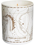 Dedicated to Corsica, the décor of Parfum d’Empire’s candles is adorned with a map of clouds scintillating with the house’s obsessions: the Island of Beauty, the horse, the vine leaf, the sea with algae, the citrus fruit...