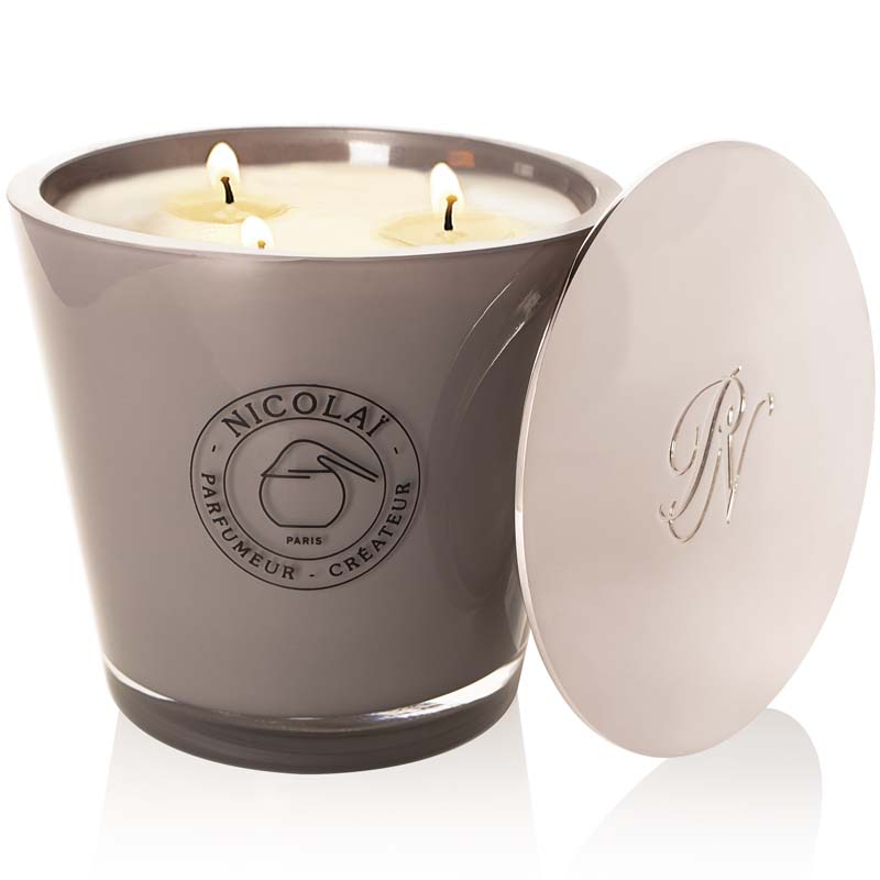 Parfums de Nicolai Maharadjah Candle shown with lid to the side and all 3 wicks lit