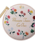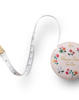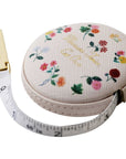 This retractable measuring tape is housed in an illustrated case with brass hardware and a hidden button release. Keep this handy tool in your sewing box, at your desk, or in your purse. The tape measures 60 inches or 152.4 centimeters.