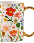 Butterflies flutter among blooms and leaves that pop against a cream backdrop on the Strawberry Fields mug. This porcelain mug features an illustrated design and a gilded rim and handle to add a little something special to your favorite beverage.