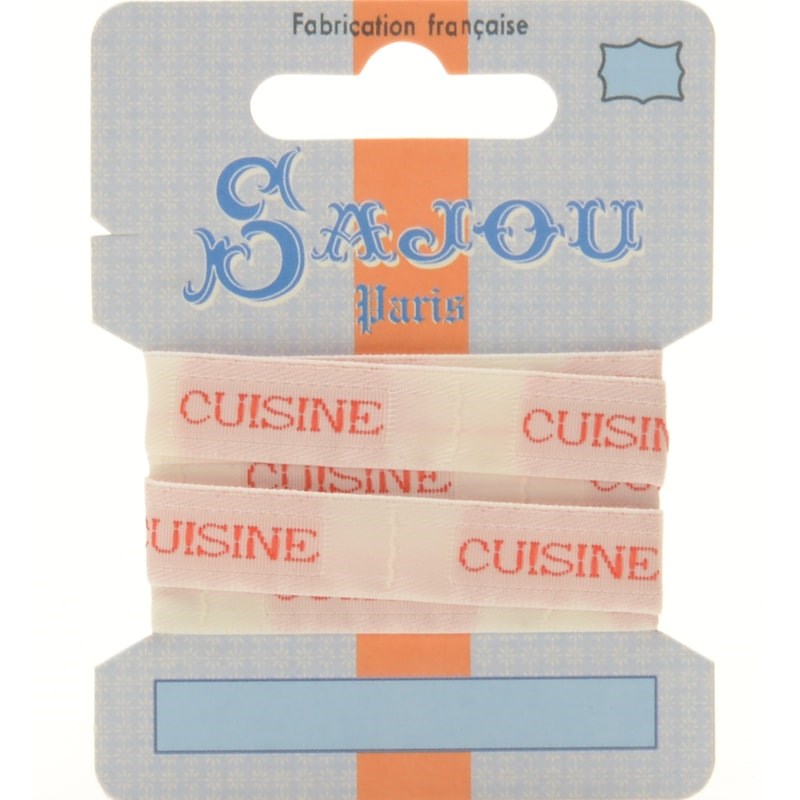 This ribbon has been specially woven for Sajou in a workshop near Saint-Etienne, historically the region for ribbon production. The card has one meter / 39.3 inches of ecru ribbon with the word "Cuisine" (French for kitchen) woven in red.