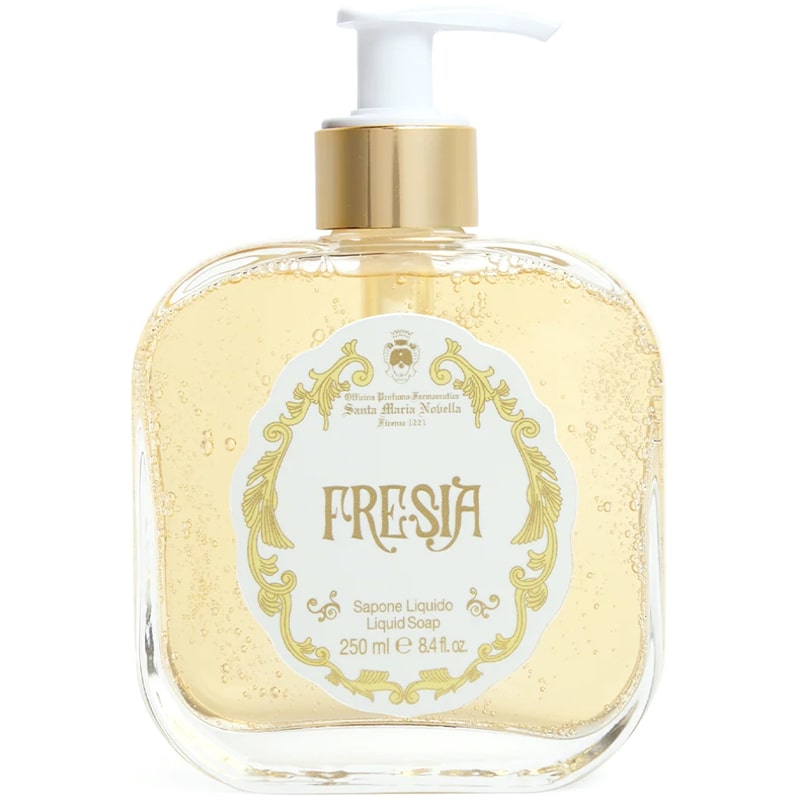 Fresia: the enveloping freshness aroma of Santa Maria Novella. The liquid soap is formulated with surfactants of vegetable origin and enriched with natural saponins. The formula is completed with calendula extract, chosen for its softening properties.