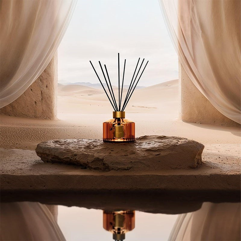 With the Altaïr collection, Trudon journeys to the desert and sand dunes: the woody, floral fragrance brings forward oud’s strong character mixed with the finesse of a warm peony.