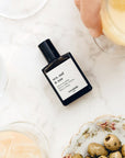 Versatile Paris Sea, Sud & Sun (Sea, South & Sun) Extrait de Parfum shown on table with beverage and spiced olive